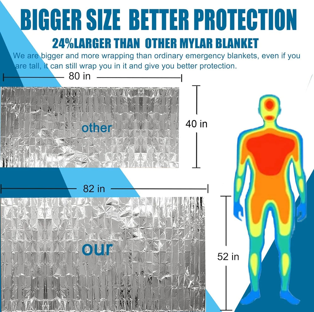 Lightweight and compact design for easy storage and portabilityReflects up to 90% of body heat, providing warmth in cold conditionsWaterproof and windproof, offering protection from rain and windLarge unfolded size for full-body coverageIdeal for first aid kits, camping gear, and emergency preparednessPerfect for hikers, campers, and travelers looking for reliable survival gearGreat for use in emergencies, outdoor activities, or as a backup in your car or home